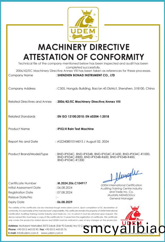 MACHINERY DIRECTIVEATTESTATION OF CONFORMITY for IPX3/4 rain test machine